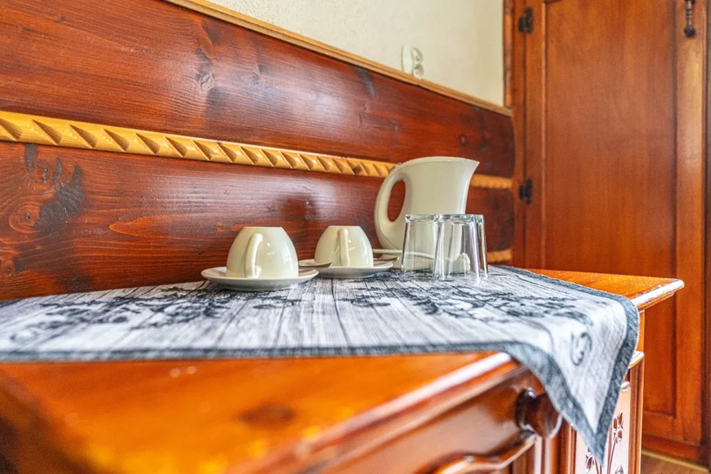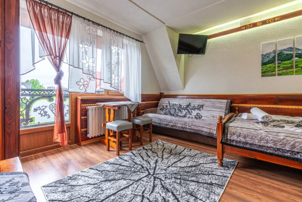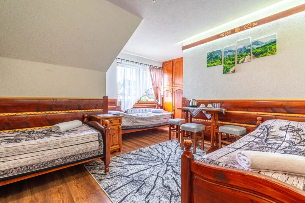 Komfortowy pokój 3-osobowy, wykończony w regionalnym stylu, z łóżkiem małżeńskim, łóżkiem pojedynczym, prywatną łazienką i widokiem na góry. Posiada: stolik z krzesłami, czajnik elektryczny, naczynia, sztućce, TV, darmowe WI-FI, a w łazience ręczniki oraz zestaw kosmetyków.